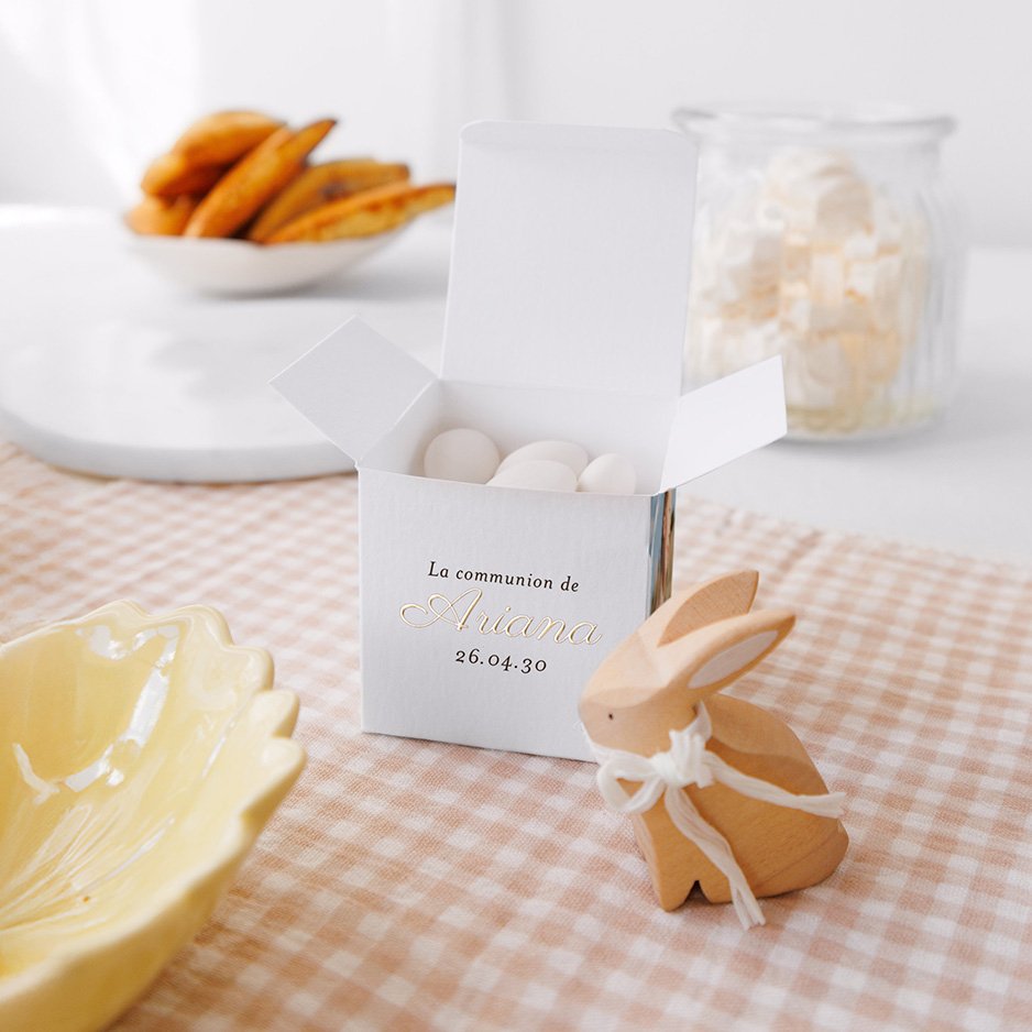 Ornés d’aquarelles fleuries, de délicates finitions dorées, d’adorables animaux illustrés, ces cubes surprises sauront trouver leur place au cœur de votre décoration de communion. Sublimez-les avec un petit message, le prénom de votre enfant et la date de sa communion et transformez ainsi ce présent original en un précieux souvenir à conserver.