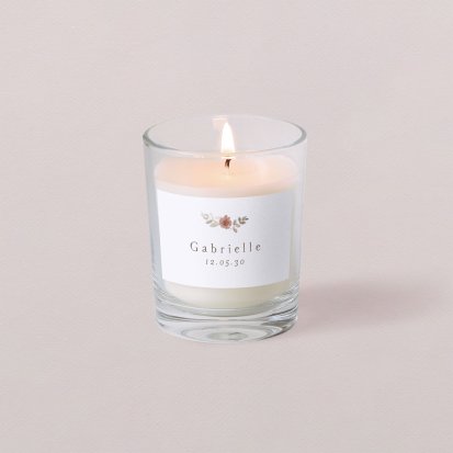 Retrouvez toute la délicatesse et la pureté de notre bougie à personnaliser, le petit cadeau idéal évoquant le souvenir d’un moment riche en émotions.
