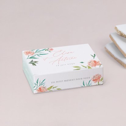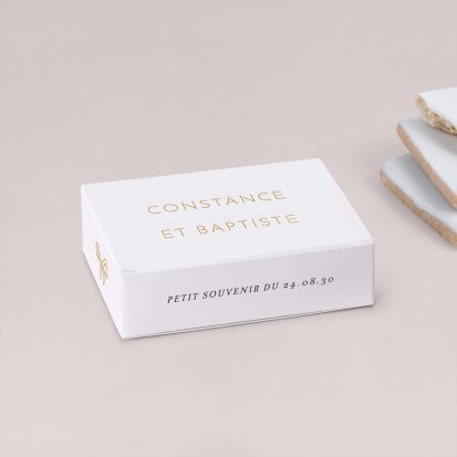 Assortie à votre papeterie de mariage, cette boîte à biscuits personnalisée enchantera vos invités ! Un cadeau élégant à remplir de douceurs sucrées (disponibles en option), en souvenir de cette superbe journée.