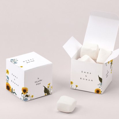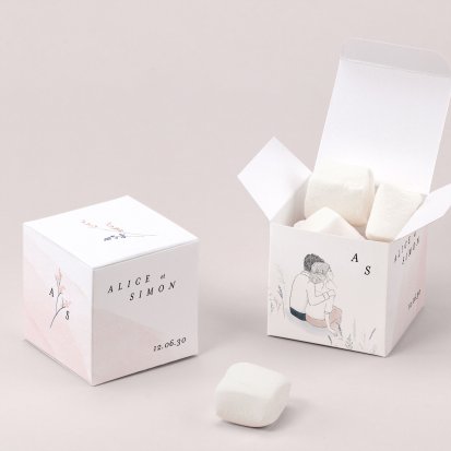 La jolie boîte personnalisée et assortie à votre faire-part. Parfaite pour offrir des macarons, sablés, calissons ou petits cadeaux. Placez-la sur la table du repas, ou sur une table à part. Ainsi, chacun viendra prendre son petit présent.