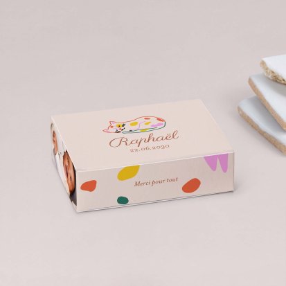 Remerciez les proches présents lors de votre grossesse et à la naissance de bébé, avec une jolie boîte à biscuits personnalisée.