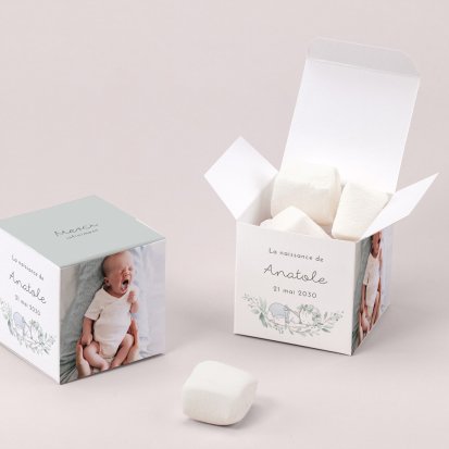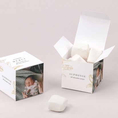 La jolie boîte personnalisée et assortie à votre faire-part. Parfaite pour offrir des macarons, sablés, calissons ou petits cadeaux. Placez-la sur la table du repas ou sur une table à part pour que chacun reparte avec son petit présent.