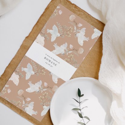 Nous possédons une large gamme de choix de menus de baptême qui suivent les tendances colorées et des motifs délicats. On y retrouve les illustrations traditionnelles du baptême :