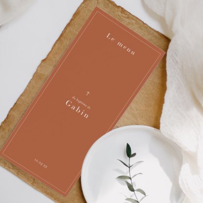 La qualité du menu de notre collection réside également dans la possibilité de le rendre unique. Un menu personnalisé impressionne les invités. Accordé aux couleurs de la décoration de salle et à votre faire-part de baptême, votre menu personnalisé s'intégrera parfaitement au reste des objets et à la vaisselle présente sur les tables.