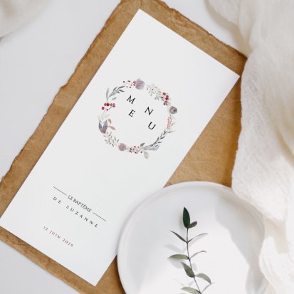 Faites-le imprimer sur nos menus assortis au faire-part ! Posés sur chacune de vos tables, ils viendront compléter votre décoration et vos invités repartiront avec un souvenir de ce merveilleux repas. Nous vous conseillons de le placer joliment au centre de l'assiette.