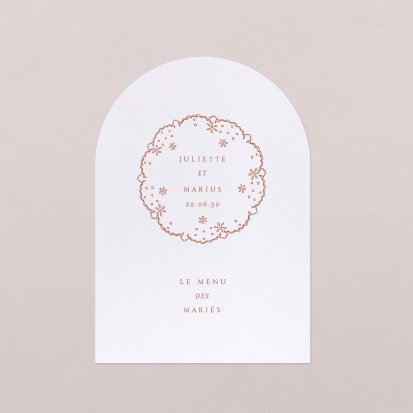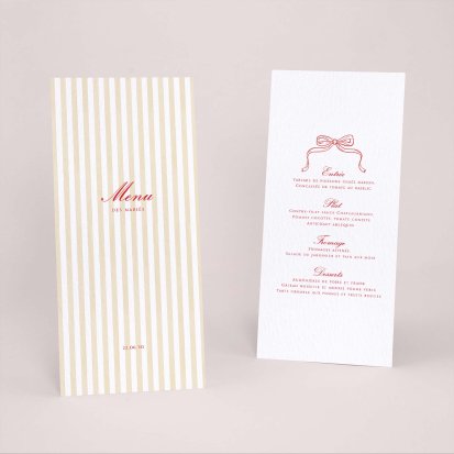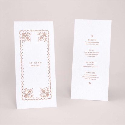 Faites-le imprimer sur nos menus assortis à votre faire-part ! Posés sur chacune de vos tables, ils viendront compléter votre décoration et vos invités repartiront avec un souvenir de ce merveilleux repas. Nous vous conseillons de le placer joliment au centre de l'assiette accompagné du marque-place.