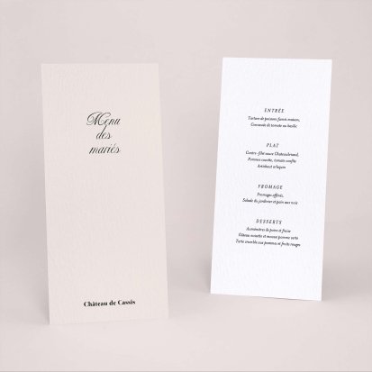 Faites-le imprimer sur nos menus assortis à votre faire-part ! Posés sur chacune de vos tables, ils viendront compléter votre décoration et vos invités repartiront avec un souvenir de ce merveilleux repas. Nous vous conseillons de le placer joliment au centre de l'assiette accompagné du marque-place.