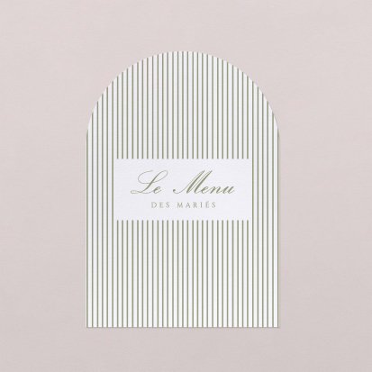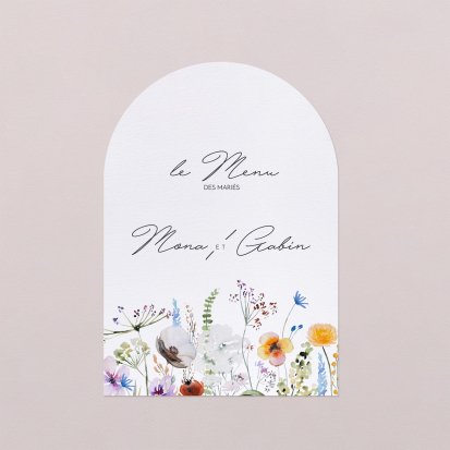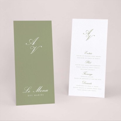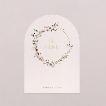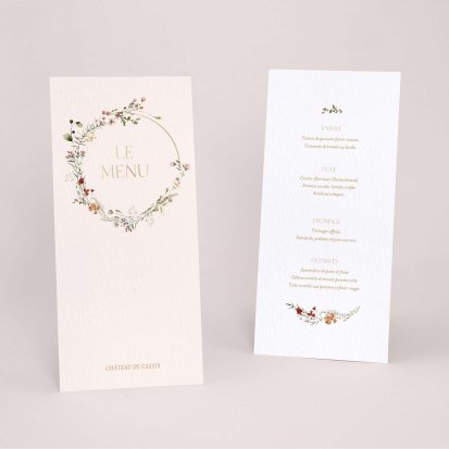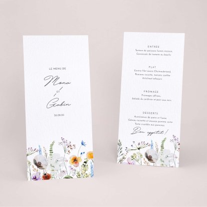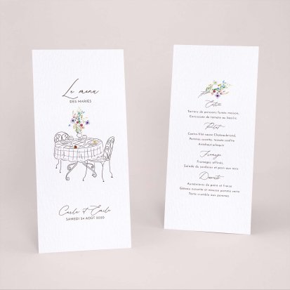 Faites-le imprimer sur nos menus assortis à votre faire-part ! Posés sur chacune de vos tables, ils viendront compléter votre décoration et vos invités repartiront avec un souvenir de ce merveilleux repas. Nous vous conseillons de le placer joliment au centre de l'assiette accompagné du marque-place.
