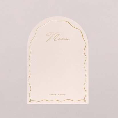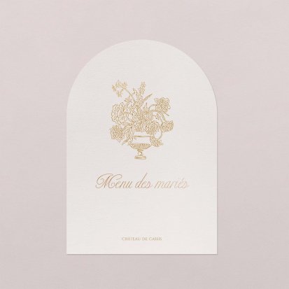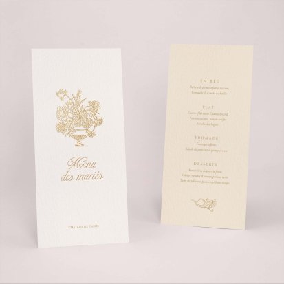 Faites-le imprimer sur nos menus assortis à votre faire-part ! Posés sur chacune de vos tables, ils viendront compléter votre décoration et vos invités repartiront avec un souvenir de ce merveilleux repas. Nous vous conseillons de le placer joliment au centre de l'assiette accompagné du marque-place.