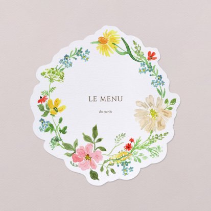 Faites-le imprimer sur nos menus assortis à votre faire-part ! Posés sur chacune de vos tables, ils viendront compléter votre décoration et vos invités repartiront avec un souvenir de ce merveilleux repas. Nous vous conseillons de le placer joliment au centre de l'assiette accompagné du marque-place.