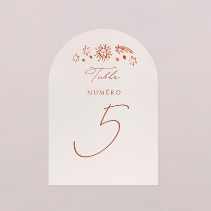 Pour apporter une note chic à votre décoration, optez pour un numéro de table orné de délicates finitions dorées, argentées, cuivrées ou encore vernis. Si ces finitions peuvent augmenter légèrement le coût de votre papeterie, elles ajouteront une touche élégante certaine et seront parfaites pour des thèmes de mariage chics.