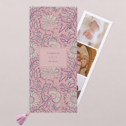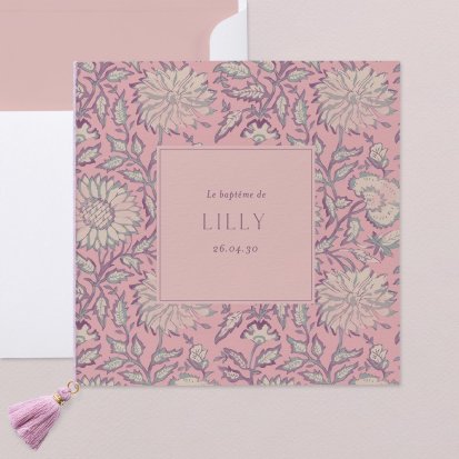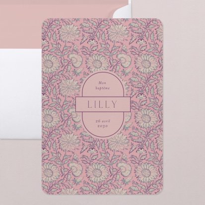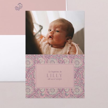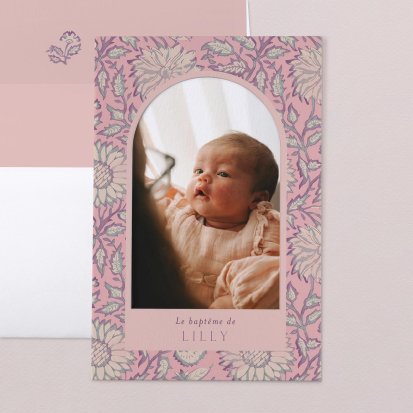 Jolis ornements végétaux et délicates fleurs dessinées, jolies couleurs pastels : découvrez nos faire-part à personnaliser, parfaits pour annoncer avec douceur le baptême de votre petite fille.