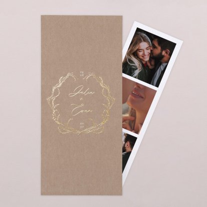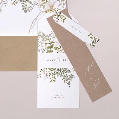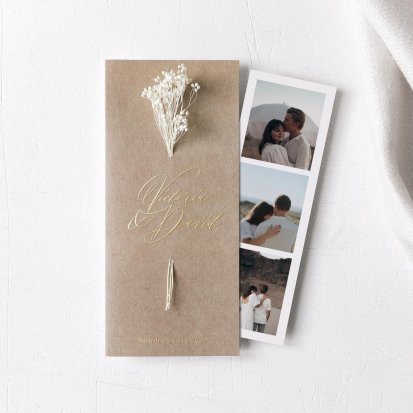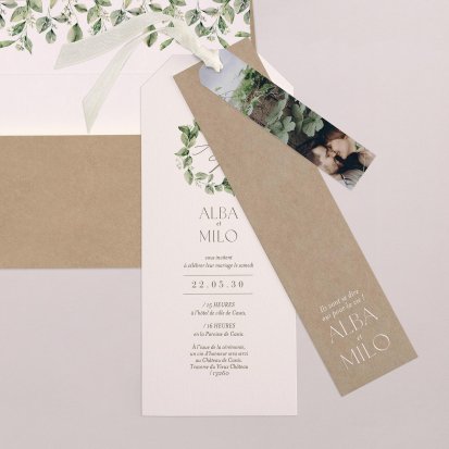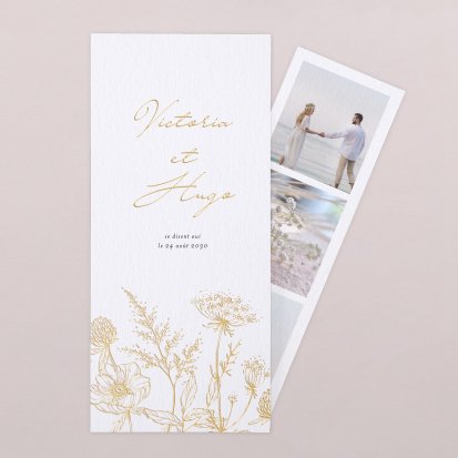 Pour un effet chic sur vos cartes d’invitation de mariage avec photo, vous pouvez ajouter une finition or, argent, cuivre ou vernis. Pour un style bohème ou vintage, privilégiez des illustrations comme un eucalyptus, des fleurs ou des dessins de mariés qui s’enlacent. Nos illustrations sont toutes réalisées par nos créatrices et vous ne les retrouverez nulle part ailleurs.