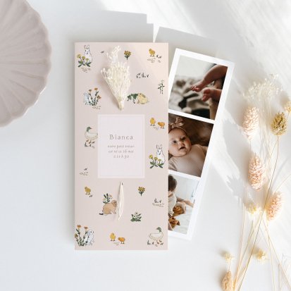 Faire le choix d’une carte de naissance avec des motifs fleuris, c’est aussi opter pour un univers de tendresse et de douceur. Plutôt petits animaux pour une touche champêtre ou belles fleurs pour l’élégance ? Nous proposons une grande variété de fonds (blanc uni, vieux rose, à motifs) et de styles (vintage, aquarelle, minimaliste…) pour faire votre bonheur.