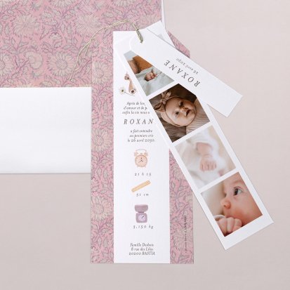 Pour ajouter des photos de votre bout de chou sans passer des heures à chercher “la” meilleure, nous vous proposons des faire-parts de naissance au format marque-page (9,5 x 21 cm).