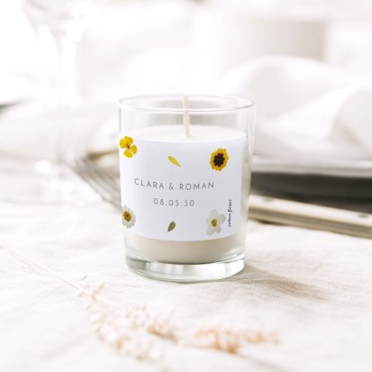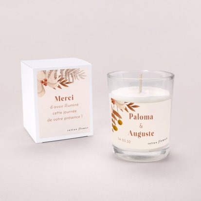 Faites briller le doux souvenir de votre union chez vos invités avec cette bougie parfumée, personnalisée et assortie au thème de cette journée unique.