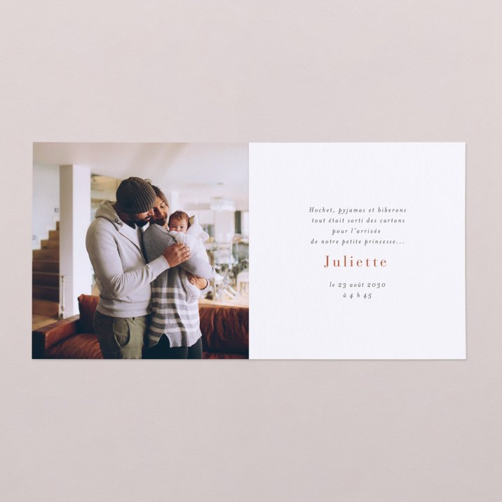 Un faire-part de naissance avec votre plus jolie photo, tout simplement... Laissez-vous séduire par le modèle Ginger et sa touche de couleur terre de sienne pour annoncer la plus belle des nouvelles.
