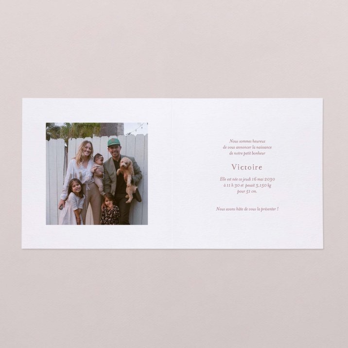 Ce faire-part de naissance se présente sous forme de carte carrée pliée. À l'ouverture, son destinataire découvrira la jolie photo de votre enfant, accompagnée de votre texte personnalisé.