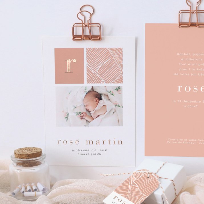 Ce faire-part de naissance se présente sous la forme d'une carte portrait, personnalisable au recto et au verso.