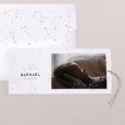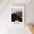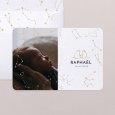 Sur le faire-part de naissance photo Nuit étoilée, une photographie de votre enfant s’invite au cœur d’un ciel étoilé. Avec d'élégantes finitions dorées et d’adorables petits ours illustrés, cette création originale enchantera vos proches, dès l'ouverture de l'enveloppe.