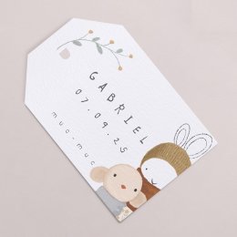 Ce faire part de naissance est une carte carrée pliée, dotée de coins arrondis pour plus de douceur. Il s'accompagne de deux étiquettes personnalisables, à lier avec un joli ruban (proposé en supplément).