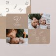 Ce faire part de naissance est une carte carrée pliée, dotée de coins arrondis pour plus de douceur. Il s'accompagne de deux étiquettes personnalisables, à lier avec un joli ruban (proposé en supplément).