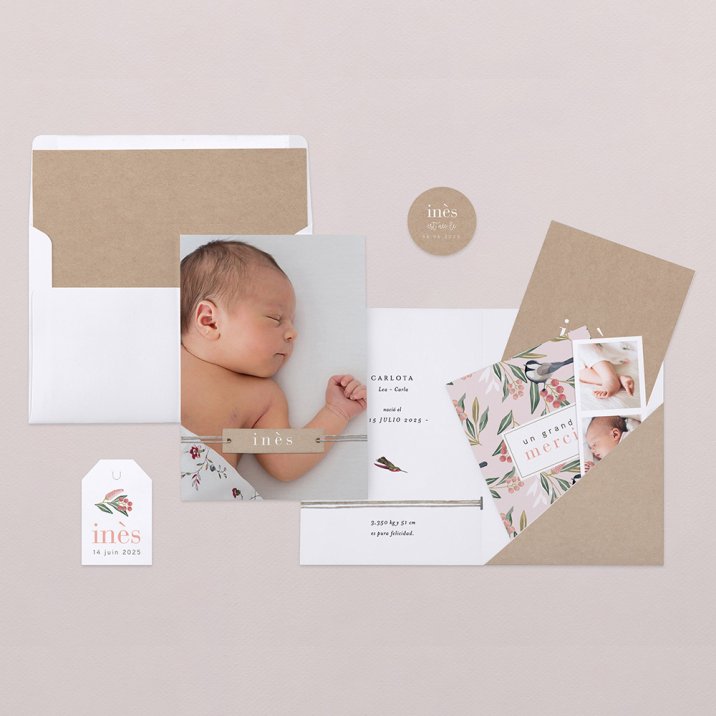 Ce modèle se présente sous la forme d'une pochette, qui comprend un faire part de naissance, un photomaton de votre nouveau-né et 2 petites cartes supplémentaires : l'une avec un texte de remerciement, l'autre avec une photo souvenir à conserver. Les 3 pièces sont placées sous le rabat intérieur, le tout étant maintenu par un élégant ruban (au choix et en supplément).