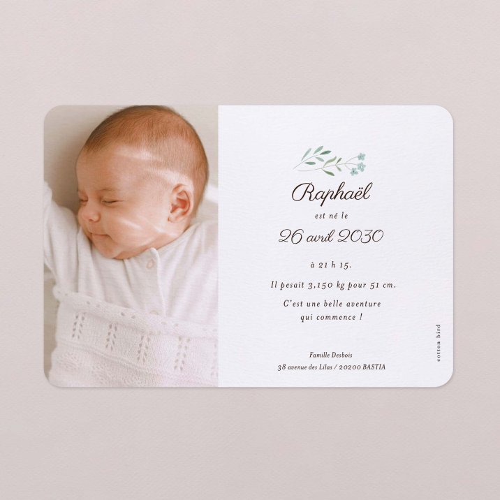 Ce faire-part de naissance se présente sous forme de carte paysage recto verso, avec des coins arrondis pour plus de douceur.