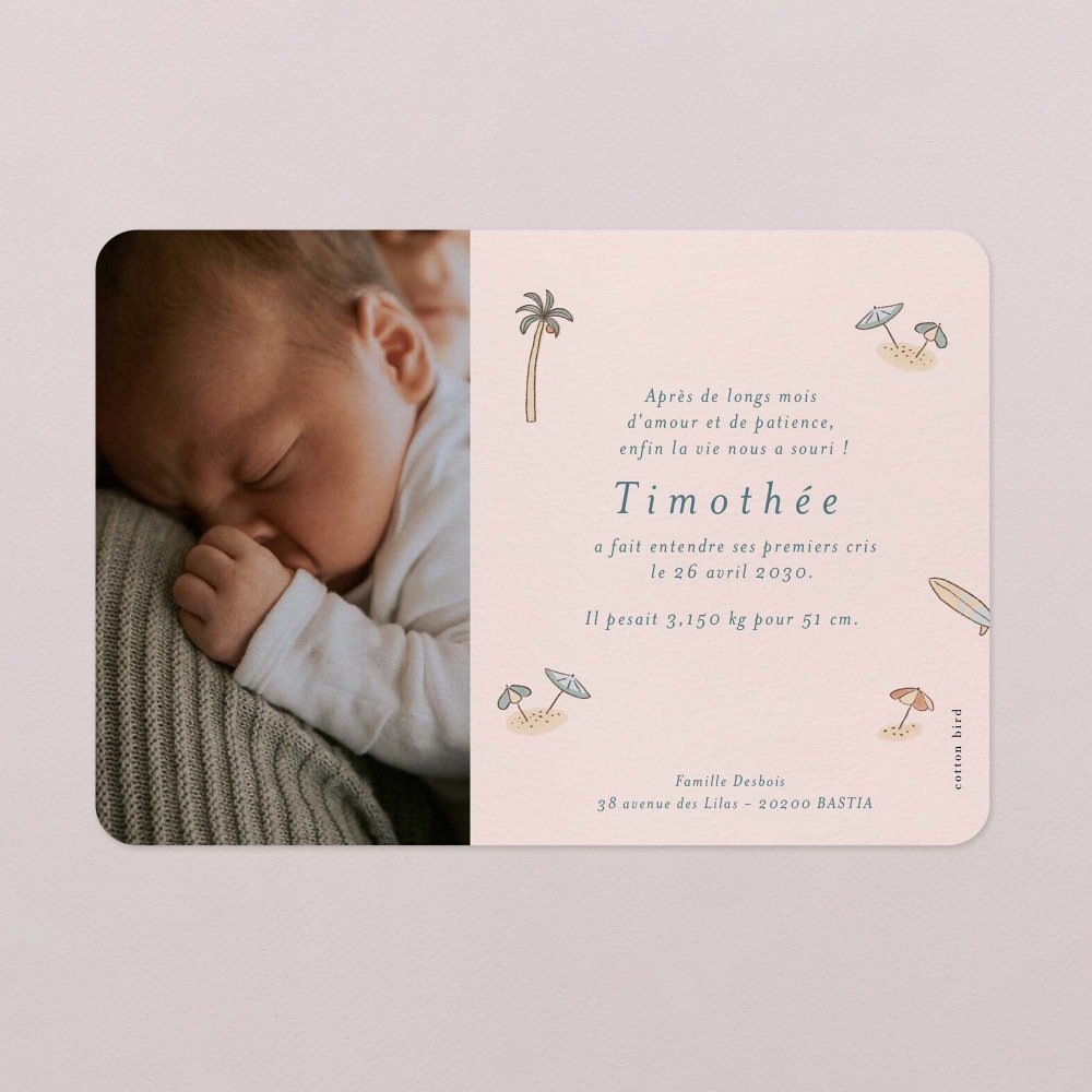Avec ses motifs et ses couleurs estivales, le faire-part de naissance Aloha évoque les longues journées d'été et de douce farniente en bord de mer. Originale, cette création contera avec une immense douceur l'arrivée de votre bonheur.
