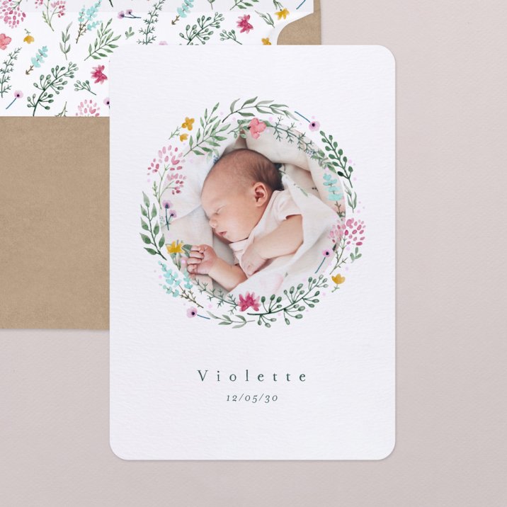 Annoncez la naissance de votre petit amour avec le faire-part Lisière et son design délicatement fleuri.