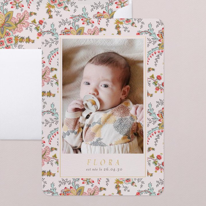 Inspiré du motif White Cashmere, le faire-part Hindi dévoile un décor dépaysant et chatoyant pour partager la photographie de votre nouveau-né, et son prénom en lettres dorées. Le modèle idéal pour les parents fans de voyages.
