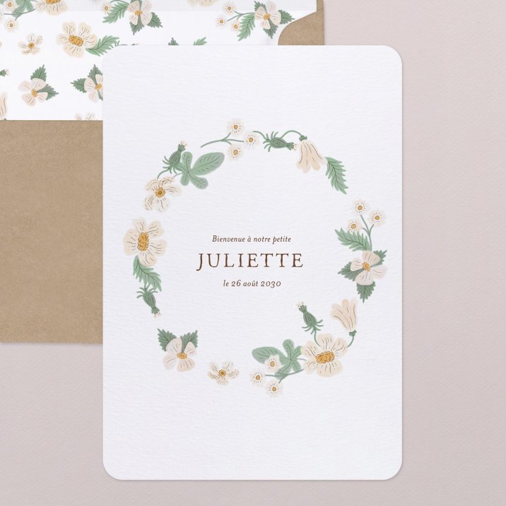 Sur le faire-part de naissance Rosa Blanca, une jolie couronne de fleurs blanches met en valeur le prénom de votre nouveau-né. Un modèle plein de fraîcheur, parfait pour un heureux évènement printanier ou estival.