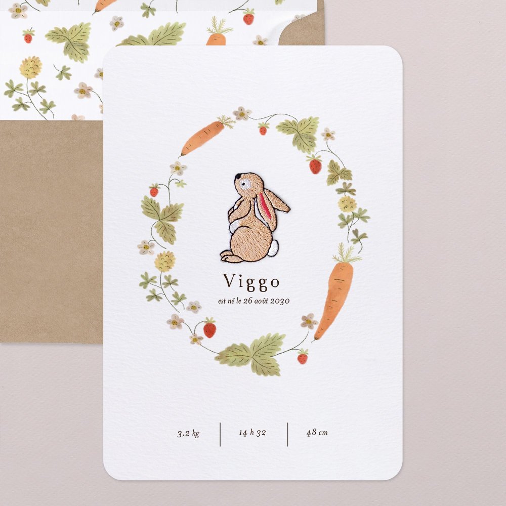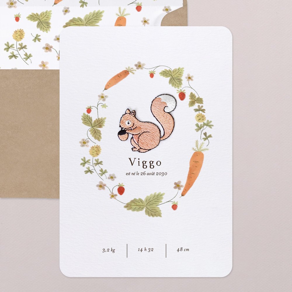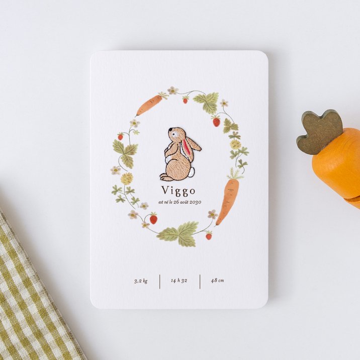 Nous sommes fiers de vous présenter le faire-part avec écusson brodé, une création originale et exclusive de notre atelier ! Partagez votre bonheur de la plus adorable des façons grâce à cet accessoire de customisation tendrement régressif, imaginé sous forme de peluches et d'animaux de la forêt. Sur le faire-part Croque carotte, c'est un petit lapin placé au cœur d'un potager qui délivrera votre heureuse nouvelle. Un tableau plein de charme mêlant illustrations et broderie, qui fera assurément craquer vos proches !