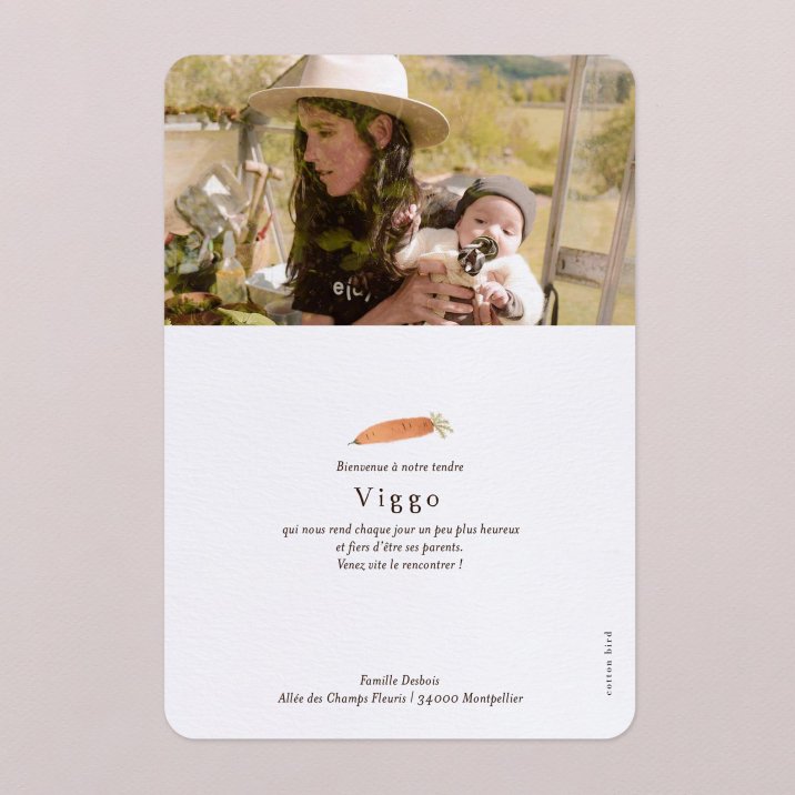 Ce faire-part de naissance se présente sous forme de carte portrait recto verso, avec des coins arrondis pour plus de douceur.