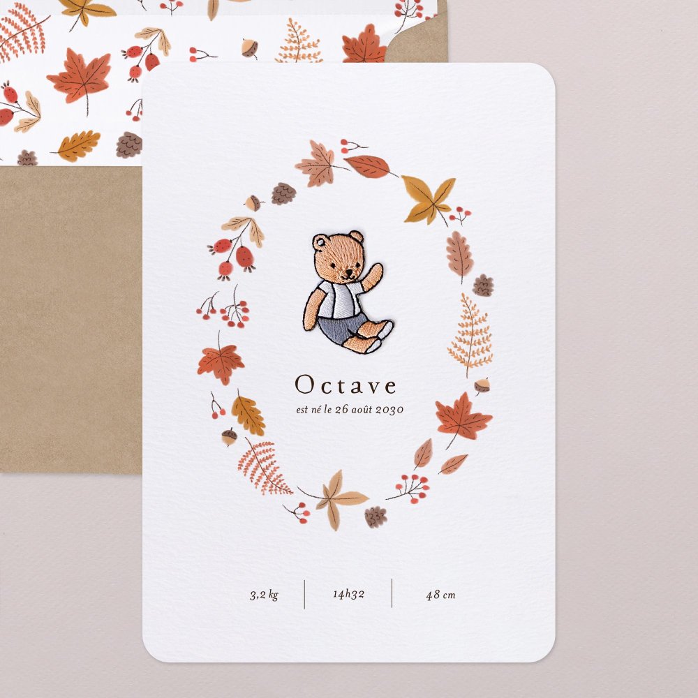 Nous sommes fiers de vous présenter le faire-part avec écusson brodé, une création originale et exclusive de notre atelier ! Partagez votre bonheur de la plus adorable des façons grâce à cet accessoire de customisation tendrement régressif, imaginé sous forme de peluches et d'animaux de la forêt. Décoré d'une couronne forestière aux chatoyants tons orangés, ce modèle sera parfait pour annoncer la naissance automnale de bébé. Nous lui avons ajouté un renardeau brodé pour une touche de charme supplémentaire. Vos proches ne peuvent que craquer !