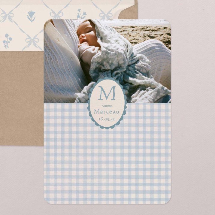 Avec son motif vichy emblématique, le faire-part de naissance Joli vichy - bleu partage tendrement, dans une composition aux teintes bleues délicates, la venue au monde de votre nouveau-né.