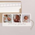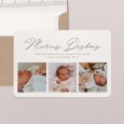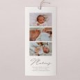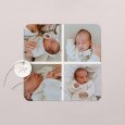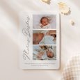 Sur le faire-part de naissance photo Diapo, vos plus beaux souvenirs s'enchaînent comme les images d'un diaporama. Ce modèle élégant met en valeur une sélection de photographies de bébé sur un fond chaleureux et naturel, accompagnée d'un beau lettrage cursif. Une création emplie d'émotion, pour partager tendrement la naissance de votre petite fille ou garçon.