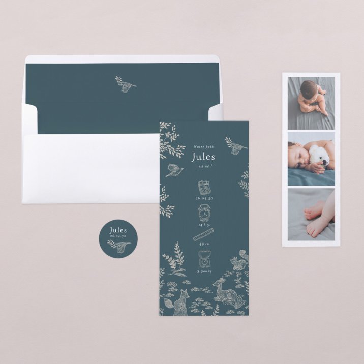 Nichées au coeur de notre Forêt endormie, les informations clés de votre bébé seront appréciées par vos êtres chers. Puis, en ouvrant ce faire-part de naissance au majestueux bleu agrémenté de détails raffinés, l'effet de surprise opérera avec la découverte de votre petit bout immortalisé sur des précieuses photos. Un modèle empreint de charme et d'élégance à conserver en souvenir.