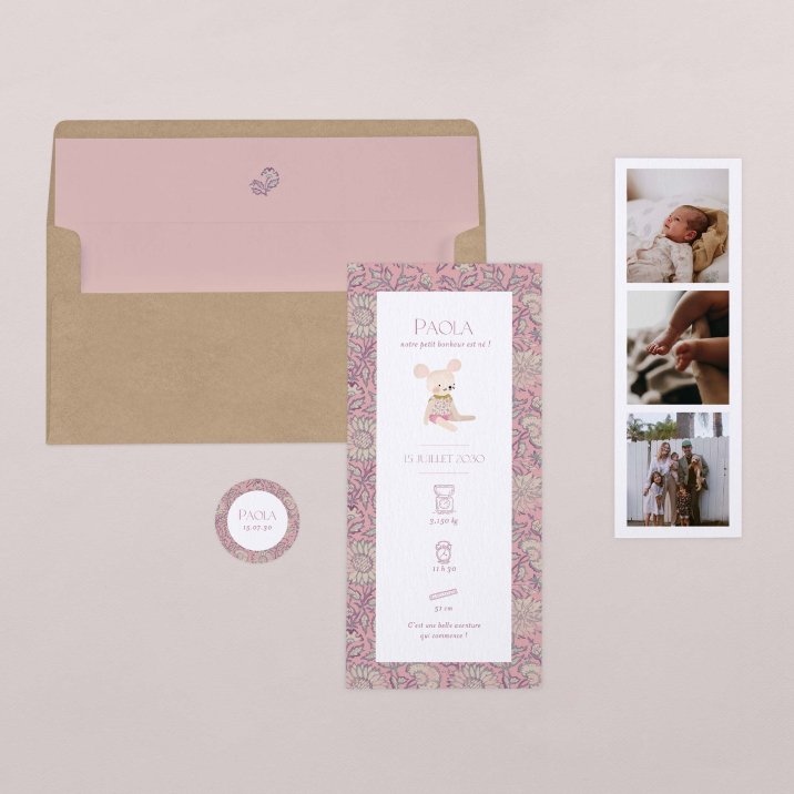 Ce faire-part de naissance se présente sous la forme d'une carte "marque-page", pliée par le milieu. À son ouverture, vos destinataires auront le plaisir de découvrir un photomaton de votre nouveau-né, apposé à côté de votre heureuse annonce.