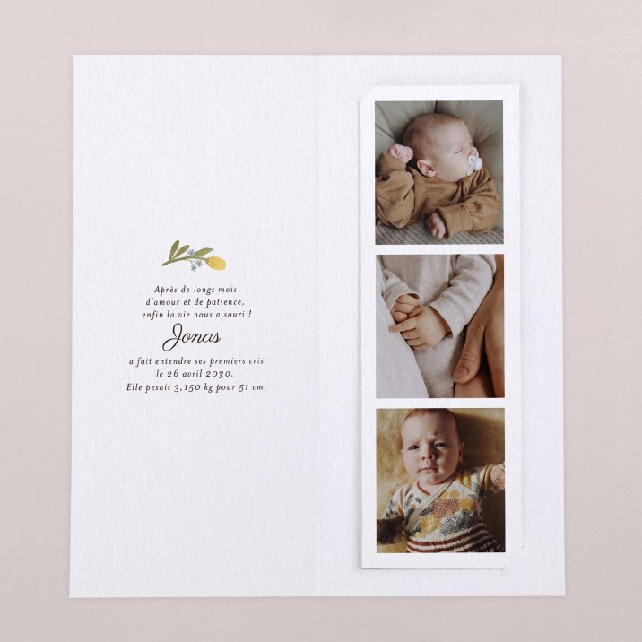Ce faire-part de naissance se présente sous la forme d'une carte "marque-page", pliée par le milieu. À son ouverture, vos destinataires auront le plaisir de découvrir un photomaton de votre nouveau-né, apposé à côté de votre heureuse annonce.