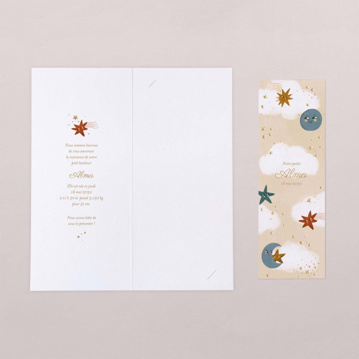 Ce faire-part de naissance se présente sous la forme d'une carte "marque-page", pliée par le milieu. À son ouverture, vos destinataires auront le plaisir de découvrir un photomaton de votre nouveau-né, apposé à côté de votre heureuse annonce.