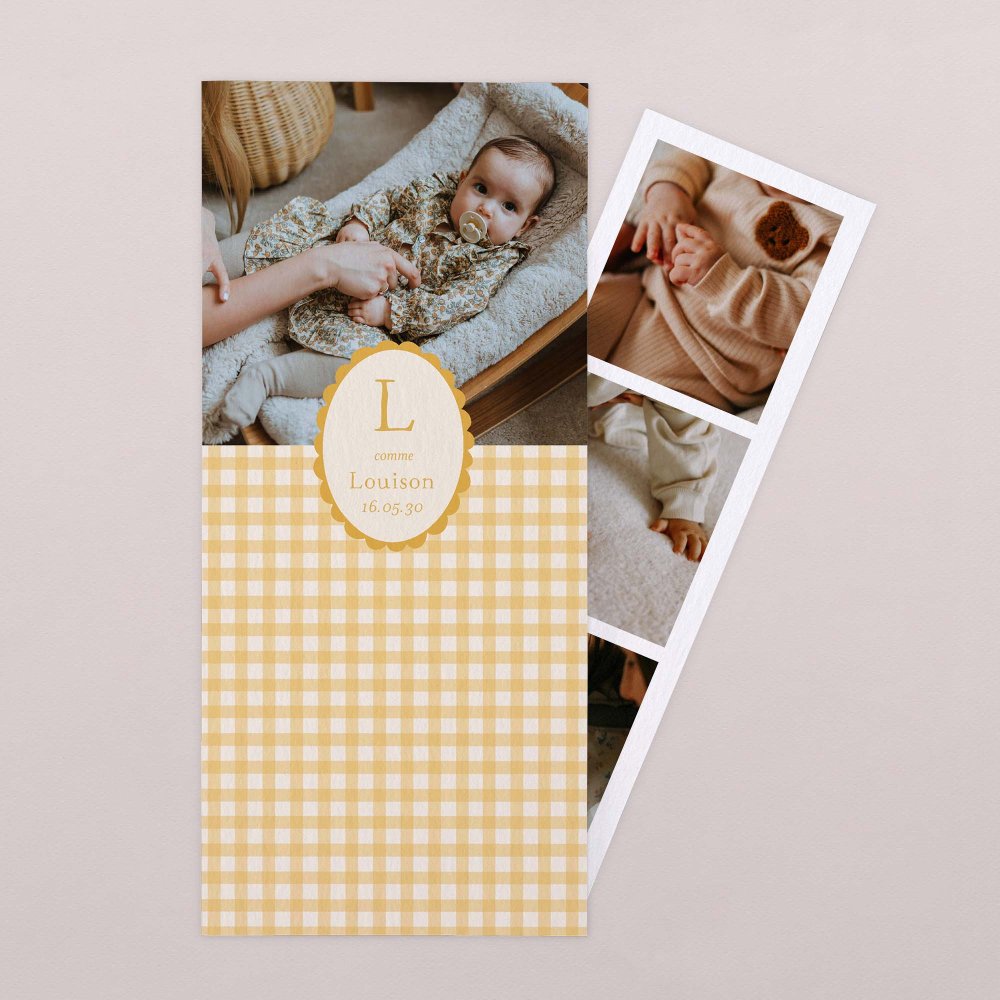 Inspiré par le tissu vichy intemporel, le faire-part de naissance Joli vichy - moutarde annonce, dans une palette de tons moutarde chaleureux, la naissance de votre enfant.