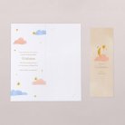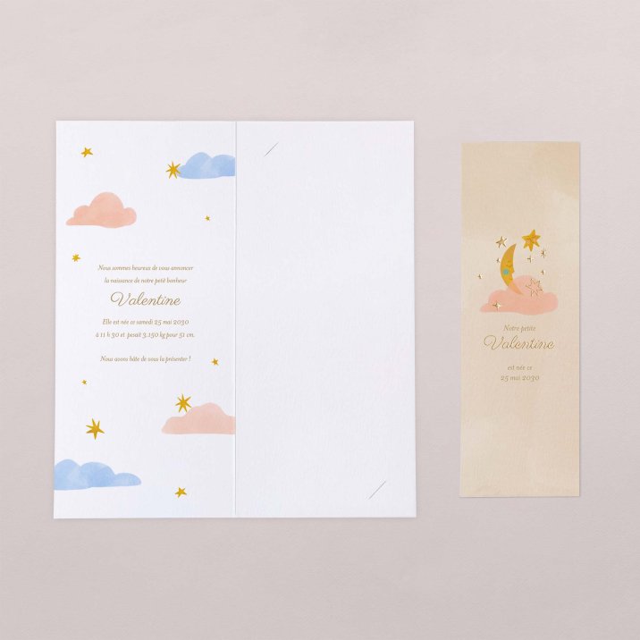 Sur le faire-part de naissance Lucy s'invitent des motifs rêveurs et enchanteurs. Dans ce ciel parsemé d'étoiles sublimées d'or s'inscrit votre heureuse nouvelle, un rêve éveillé à partager avec ceux que vous aimez.