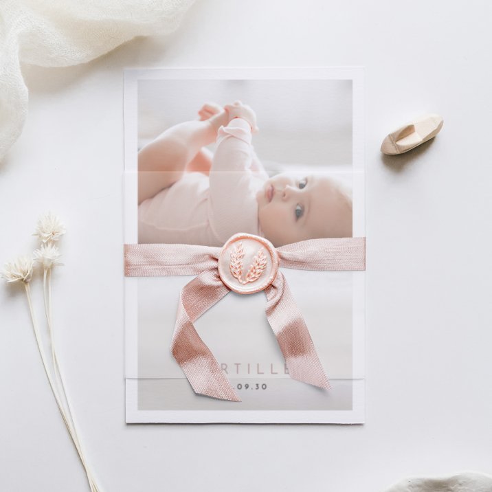 Ce faire-part est composé d'une carte recto verso personnalisable et d'un calque, conçu pour être glissé tel un fourreau autour de celle-ci. Pour un rendu du plus bel effet, nous vous suggérons de compléter chaque faire-part avec un cachet de cire et un ruban assorti (proposés en accessoires optionnels).