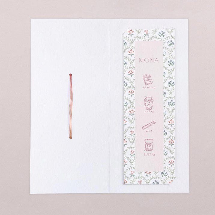 Célébrez l'arrivée de votre petit trésor avec le faire-part de naissance Gardenia. Les motifs fleuris roses et champêtres créent un ensemble élégant et raffiné, parfait pour annoncer la venue au monde de bébé.