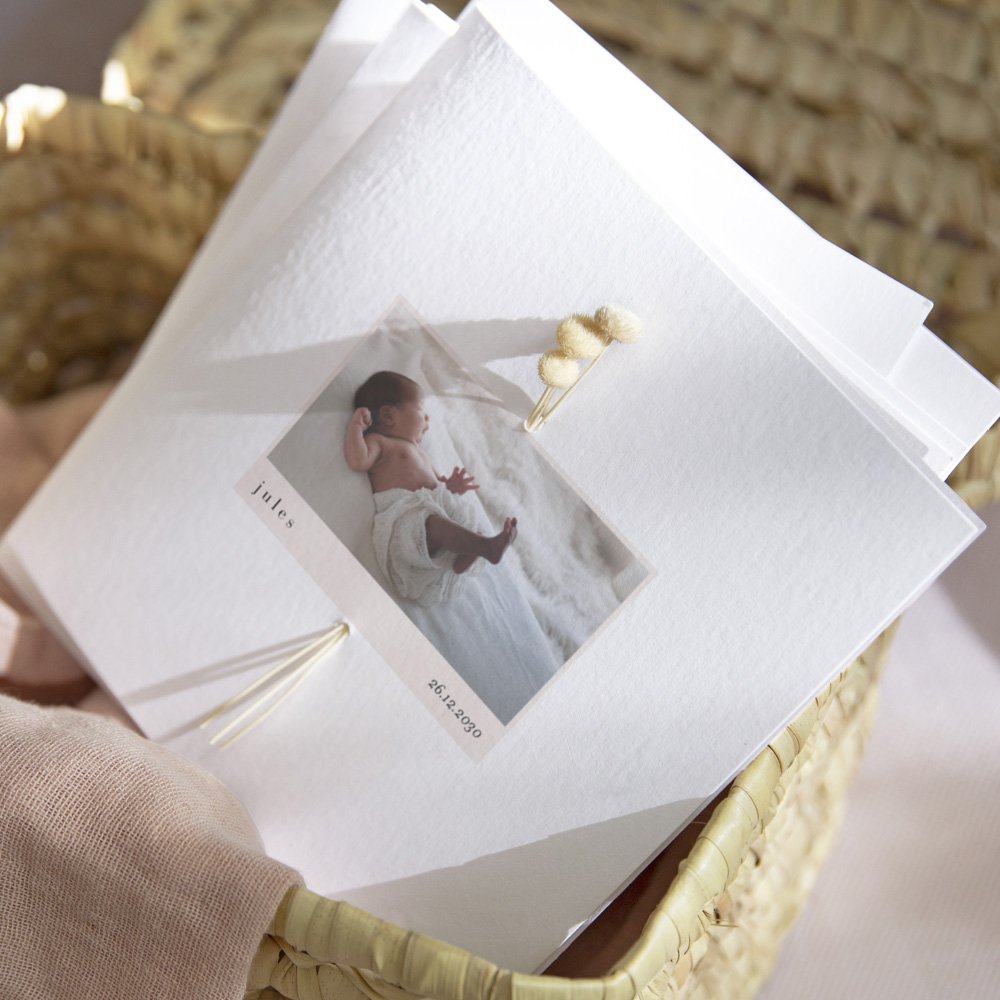 D'une élégance épuré, le faire-part de naissance Pia fera la part belle à la photographie de votre nouveau-né. Un modèle à sublimer de brins de fleurs séchées pour une touche d'originalité.