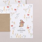 Nous sommes fiers de vous présenter le faire-part avec écusson brodé, une création originale et exclusive de notre atelier ! Partagez votre bonheur de la plus adorable des façons grâce à cet accessoire de customisation tendrement régressif, imaginé sous forme de peluches et d'animaux de la forêt. Avec ses illustrations de fleurs sauvages et d'épis de blé, ce modèle sera parfait pour un enfant né à la fin de l'été. Un petit lapin brodé placé en son centre ajoutera une touche de charme supplémentaire à votre heureuse annonce.