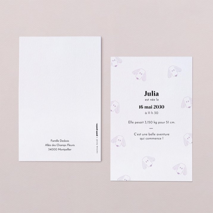 Annoncez l’arrivée de votre bébé avec le faire-part de naissance Purple Gang. Sur un doux fond mauve, d'adorables chiots inspirés de l'iconique motif de Gamin Gamine sont illustrés, apportant charme et créativité à votre annonce.