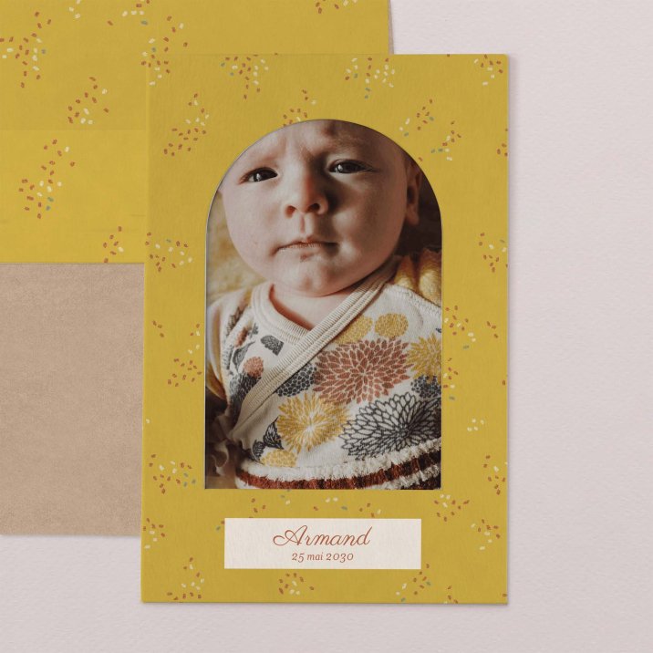 Ce faire-part de naissance se présente sous la forme d'une carte portrait pliée, avec une élégante découpe en forme d'arche sur sa couverture. Cette dernière mettra en valeur la photo de votre nouveau-né, imprimée sur une carte volante glissée à l'intérieur.