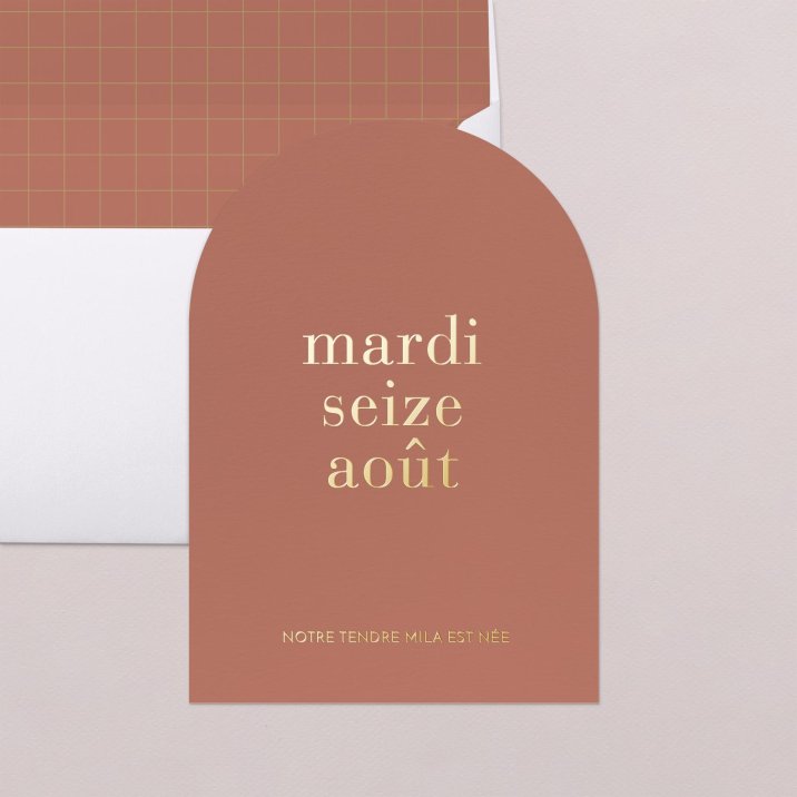 Résolument contemporain, le faire-part de naissance Precious terracotta fait la part belle à votre heureuse nouvelle : la venue au monde de votre enfant. Couleur chaleureuse et lettrage doré subliment ce modèle : vos proches vont l'adorer !
